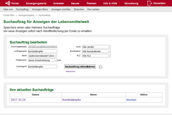 Um die Funktion "Suchauftrag" jetzt anzuschauen, musst du eingeloggt sein. Dann klick bitte auf das obige Bild oder auf den nachfolgenden Link. Du findest diesen Link auch in der Startseite jedes Anzeigenmarktes und in allen Seiten von lebensmittelwelt.de in der grauen Menüleiste als Eintrag "Suchauftrag".